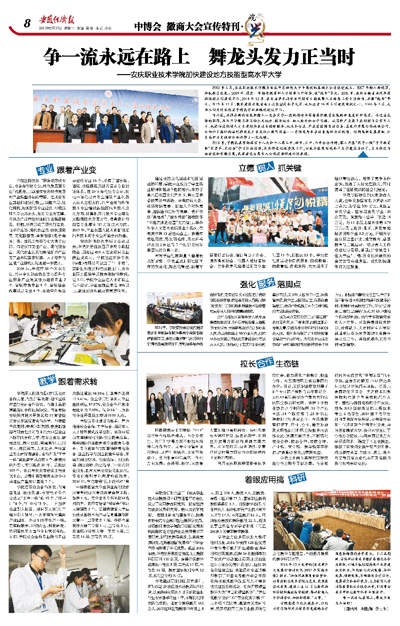 可以说,求强求新的安庆职院人一直在用争一流的精神书写着高职教育发展的新速度和新高度。而这些成绩的取得,离不开学院长期坚持立足地方、服务地方、融入地方的办学思路。从围绕产业设专业到校企合作育人才,从提供技能型人才支撑到推出技术创新服务,从服务企业、产业园区到直接与县、区政府开展全面战略合作,从加强中高职衔接到推动成立安庆职业教育联盟……学院近年来在探索高职办学规律、创新高职发展实践、担负高职历史使命方面取得了一定成绩。