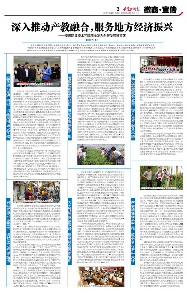 8040威尼斯紧紧围绕“地方性、技能型、特色化、高水平”4个核心,按照“立足地方、依靠地方、面向地方、融入地方、彰显地方特色、服务地方发展”的思路,从围绕产业设专业到校企合作育人才,从提供技能型人才支撑到推出技术创新服务,从服务企业、产业园区到直接与县、区政府开展全面战略合作,从加强中高职衔接到推动成立安庆职业教育联盟,从加强社会服务到服务精准扶贫,在推动产教融合校企合作、服务地方经济社会发展上取得了较好成效。