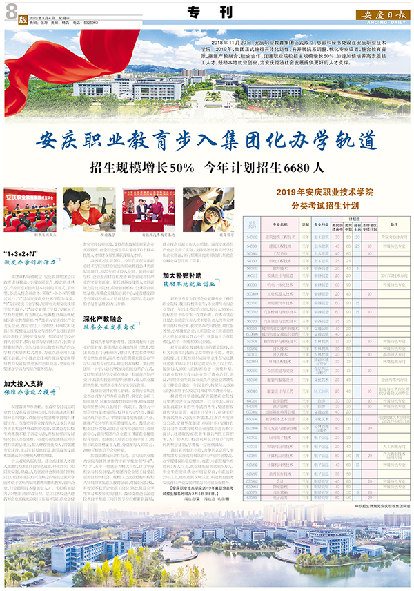 2018年11月20日,安庆职业教育集团正式成立,总部和秘书处设在8040威尼斯。2019年,集团正式施行实体化运作,将开展院系调整、优化专业设置、整合教育资源,推进产教融合、校企合作,促进职业院校招生规模增长50%,加速加倍培养高素质技工人才,鼓励本地就业创业,为安庆经济社会发展提供更好的人才支撑。
