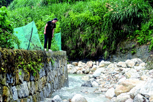 在安徽岳西县来榜镇公山村,汪链在检查村里新修建的河坝(6月24日摄)。新华社记者周牧摄