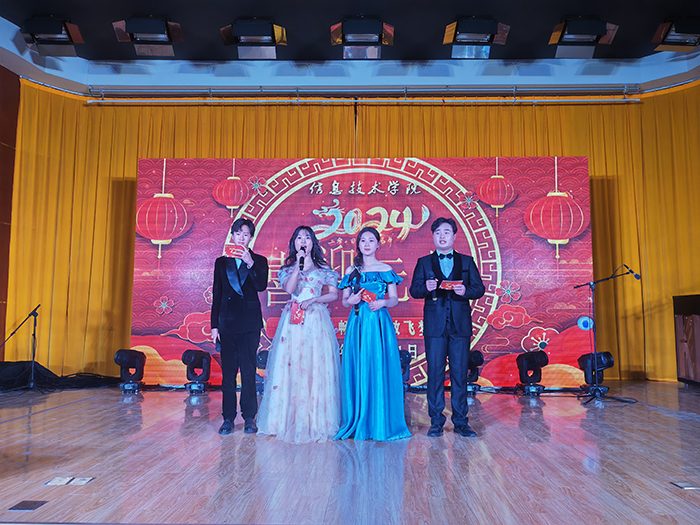 此次晚会经历了一个半月的精心策划和筹备,从节目单、宣传海报、背景的设计与制作,视频素材的拍摄与剪辑,到现场精美的服装设计、化妆、道具与布景,无不凝聚了信息技术学院师生的智慧与汗水,展现了我院学生“自我教育,自我管理,自我服务”的又一成果。2024,信息技术学院将再续辉煌,书写新的篇章!(文、图:信念新媒体工作室 审稿:疏国会)