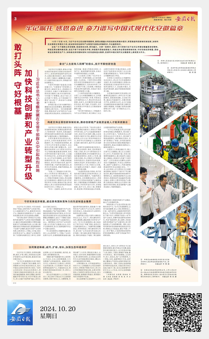 安徽日报:敢打头阵 守好根基 加快科技创新和产业转型升级 ——习近平总书记考察安徽在全省干部群众中引起热烈反响