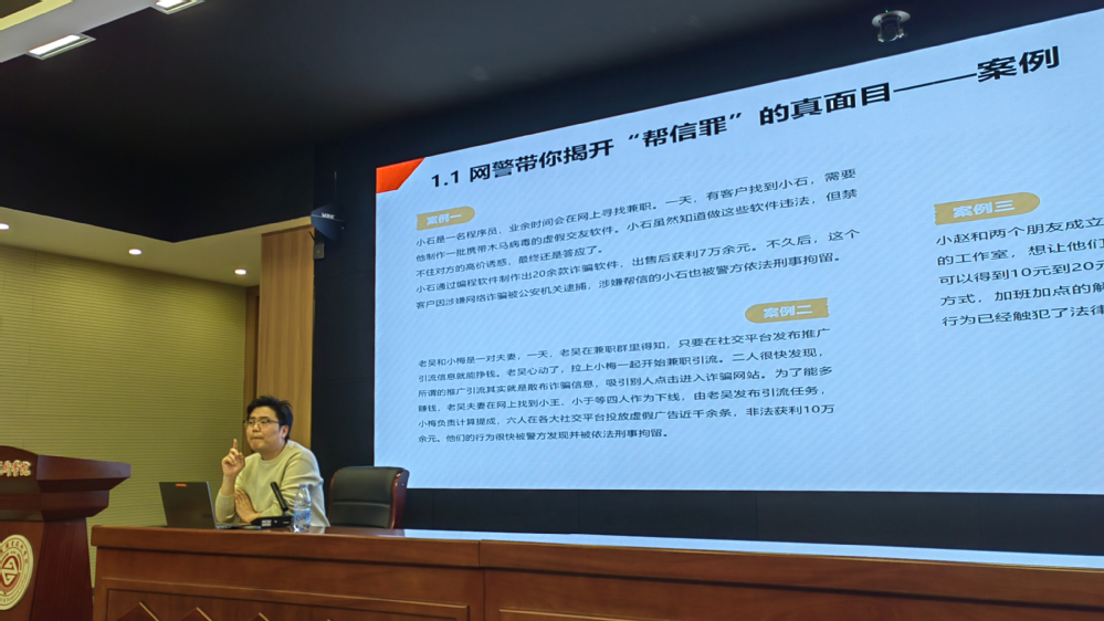 讲座围绕“电信网络诈骗常见类型、电信网络诈骗预防、提升个人网络安全意识”等三个方面展开,黄亚运通过案例讲解,播放视频,以通俗易懂的语言与现场师生进行了分享与交流。他以电影《孤注一掷》中的杀猪盘骗局为切入点,详细介绍了仿冒身份诈骗、购物类诈骗、活动类诈骗、利益诱惑类诈骗、虚假险情诈骗、日常生活消费诈骗、钓鱼木马病毒类诈骗、提供特定服务类诈骗、针对学生类诈骗、办公类诈骗等十种常见诈骗类型。同时,就如何预防电信网络诈骗给出了具体建议,尤其是要保护好个人信息,防止个人信息泄露。他认为,要通过提升法律意识和日常网络安全意识来提升个人网络安全意识和防范能力。整场讲座内容丰富、重点突出,持续了近一个小时,现场掌声不断、反响热烈。