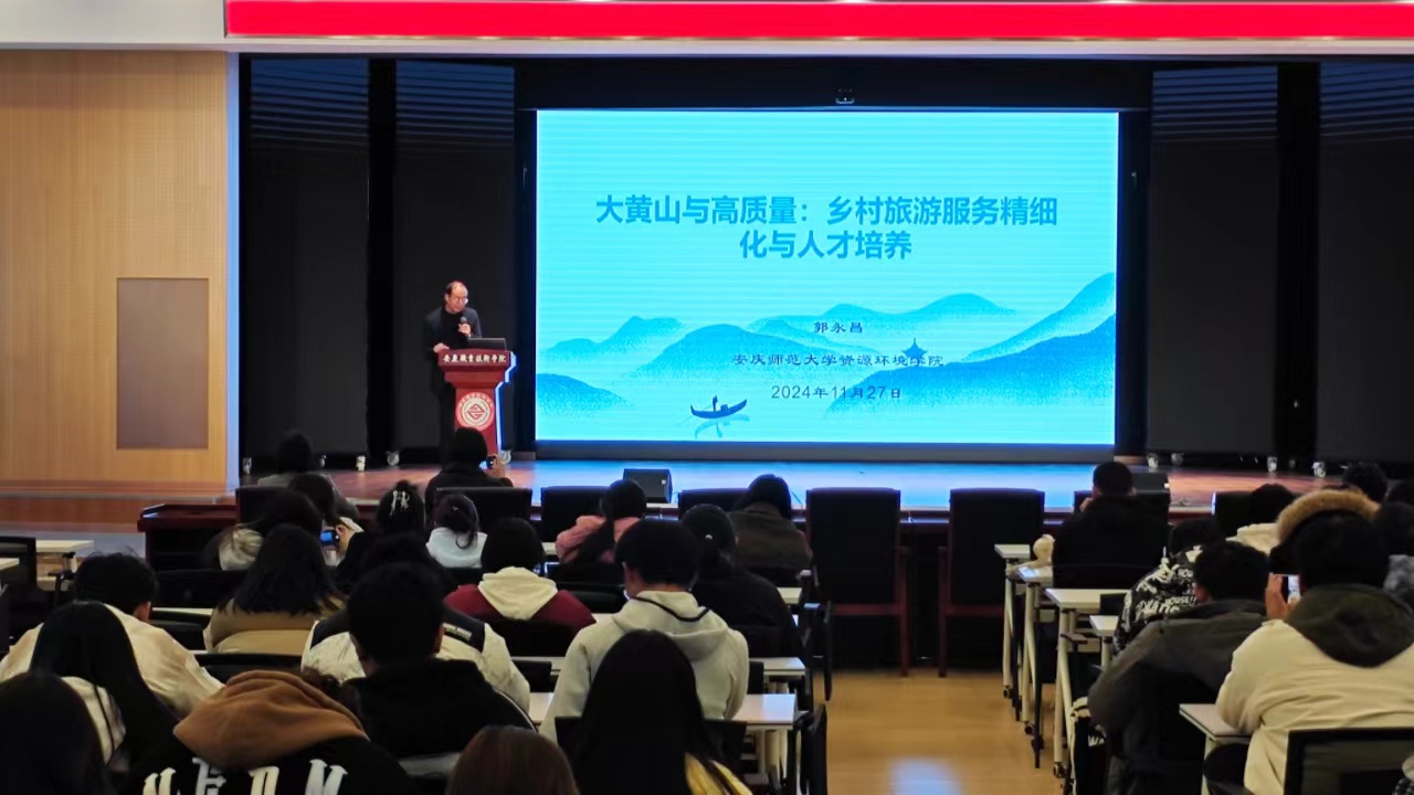 11月27日下午,安庆师范大学资源与环境学院郭永昌博士在实训楼报告厅作《大黄山与高质量:乡村旅游服务精细化与人才培养》专题讲座,旅游管理专业和酒店管理与数字化运营专业师生参加了讲座。