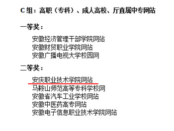 近日,安徽省第三届优秀教育门户网站评选结果公布,我院喜获C组高职(专科)、成人高校、厅直属中专类网站二等奖。 本次评选活动由省教育厅组织举办,旨在贯彻落实国家及我省中长期教育改革和发展规划纲要,进一步加快教育信息化进程,推进教育门户网站在提升教育部门形象、提高教育服务水平和行政效能、建设服务型政府等方面发挥更大作用。