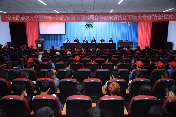 11月21日,我院与申洲针织安徽有限公司合作举办的首届“申洲大专班”开班, 55名员工将在公司内接受工学一体方式的服装设计与工艺专业教育。院长孙晓峰、望江县副县长汪森、公司副总经理沈冬出席开班仪式并讲话。公司总经理夏晓鸣和副院长谭维奇代表双方签订合作办学协议。谭维奇主持仪式。