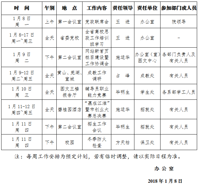 2017-2018学年第一学期第20周(1.8-1.14)工作安排