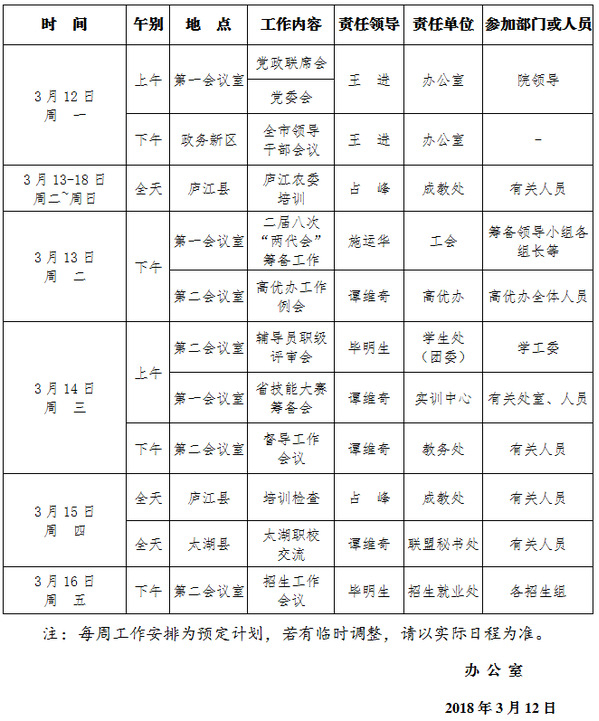2017-2018学年第二学期第4周(3.12-3.18)工作安排