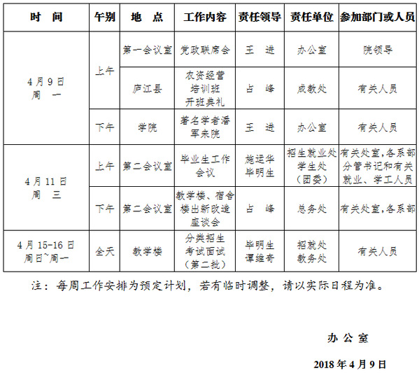 2017-2018学年第二学期第8周(4.9-4.15)工作安排
