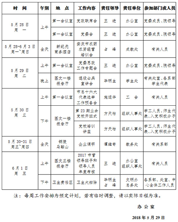 2017-2018学年第二学期第15周(5.28-6.3)工作安排