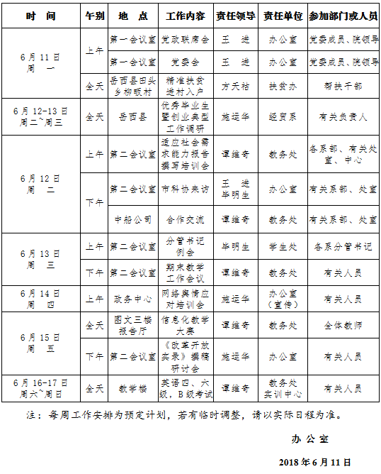 2017-2018学年第二学期第17周(6.11 -6.17)工作安排