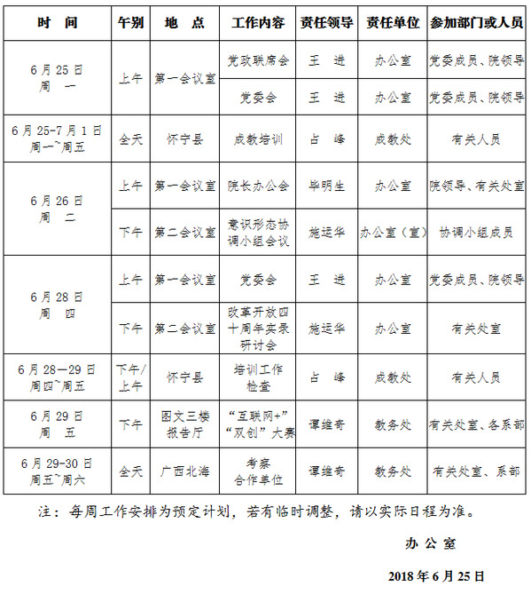 2017-2018学年第二学期第19周(6.25 -7.1)工作安排