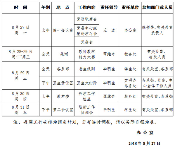 2018-2019学年第一学期第1周(8.27-9.2)工作安排