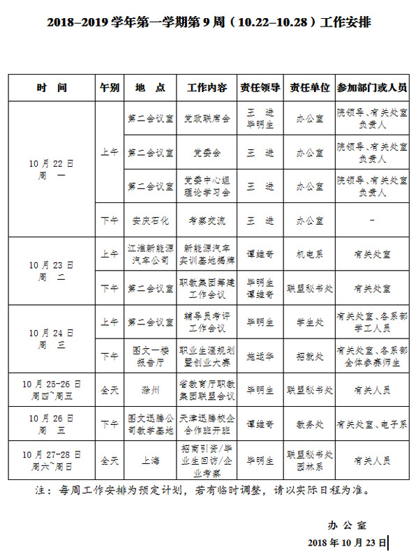 2018-2019学年第一学期第9周(10.22-10.28)工作安排