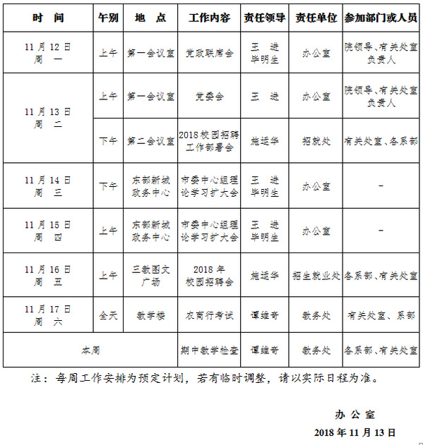 2018-2019学年第一学期第12周(11.12-11.18)工作安排