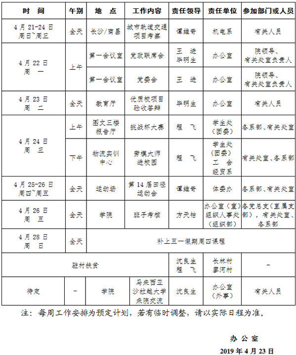 2018-2019学年第二学期第10周(4.22-4.28)工作安排