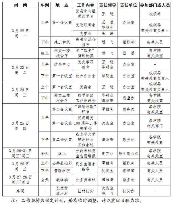 2020-2021学年第二学期第4周(3.22-3.27)工作安排