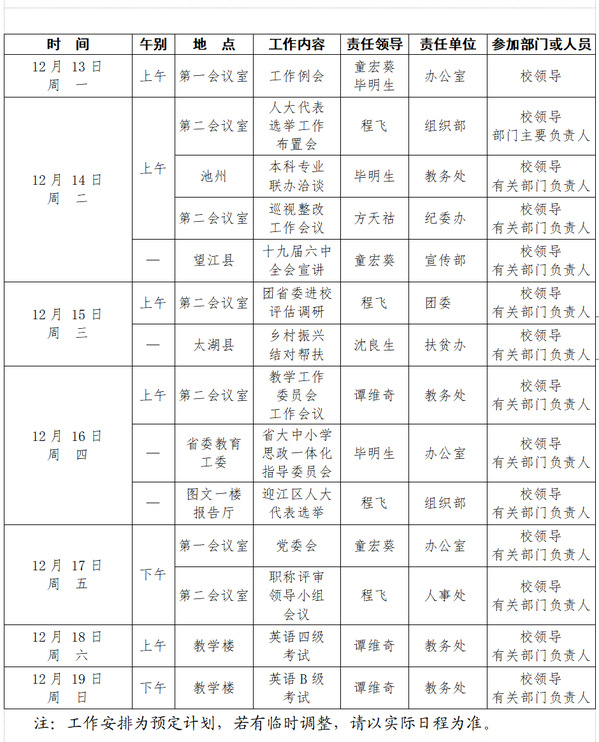 2021-2022学年第一学期第16周(12.13-12.19)工作安排