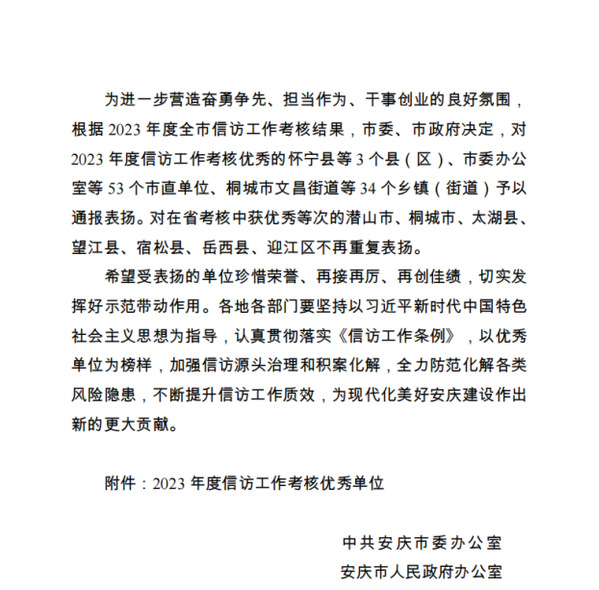 日前,威尼斯官网被安庆市委授予“2023年度全市信访工作优秀单位”荣誉称号。这一荣誉不仅是对学校信访工作成效的高度认可,也是对学校致力于构建和谐校园环境、积极服务师生和社会的充分肯定。