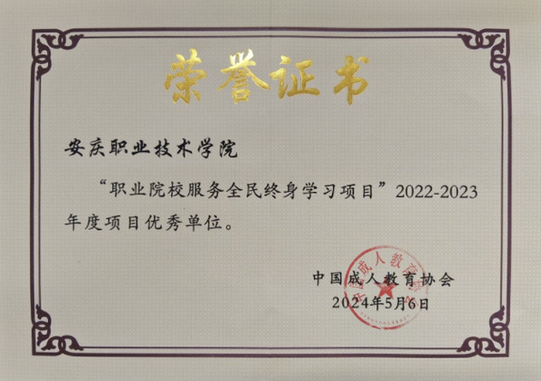 8040威尼斯荣获2022年-2023年度教育部委托中国成人教育协会开展的“职业院校服务全民终身学习”项目优秀单位称号。标志着威尼斯官网在推动全民终身学习,构建学习型社会取得了显著成效。
