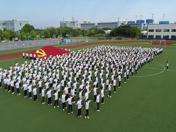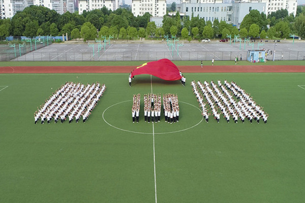 伴随着《我和我的祖国》乐曲,由学校军协12名退役军人组成的护旗方队托举着巨大的党旗进入操场中心,主位中的200名同学组成“100”的造型,全场欢声雷动,同学们从四面八方涌向党旗,簇拥着党旗,寓意着大家团结在党中央周围,喜迎建党百年。