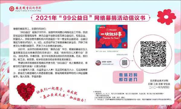 9月4日至9月9日期间,为让更多的师生增强公益意识,正确了解公益、理解公益的本质和核心,校妇联根据市妇联的“安庆市妇儿关爱行动”项目总体设计,携手校工会、校团委、校学生会向全校师生发出《2021年“99公益日”网络募捐活动倡议书》,并通过制作专门展板、校公众号、多个公共工作微信群等媒介,宣传公益相关知识、介绍“99公益日”活动内容及形式,号召全体师生参与到公益日活动之中。