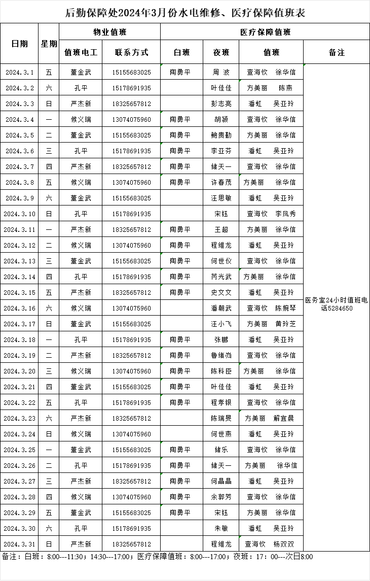 后勤保障处2024年3月份水电维修、医疗保障值班表