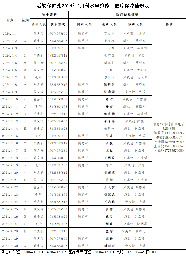 后勤保障处2024年4月份水电维修、医疗保障值班表