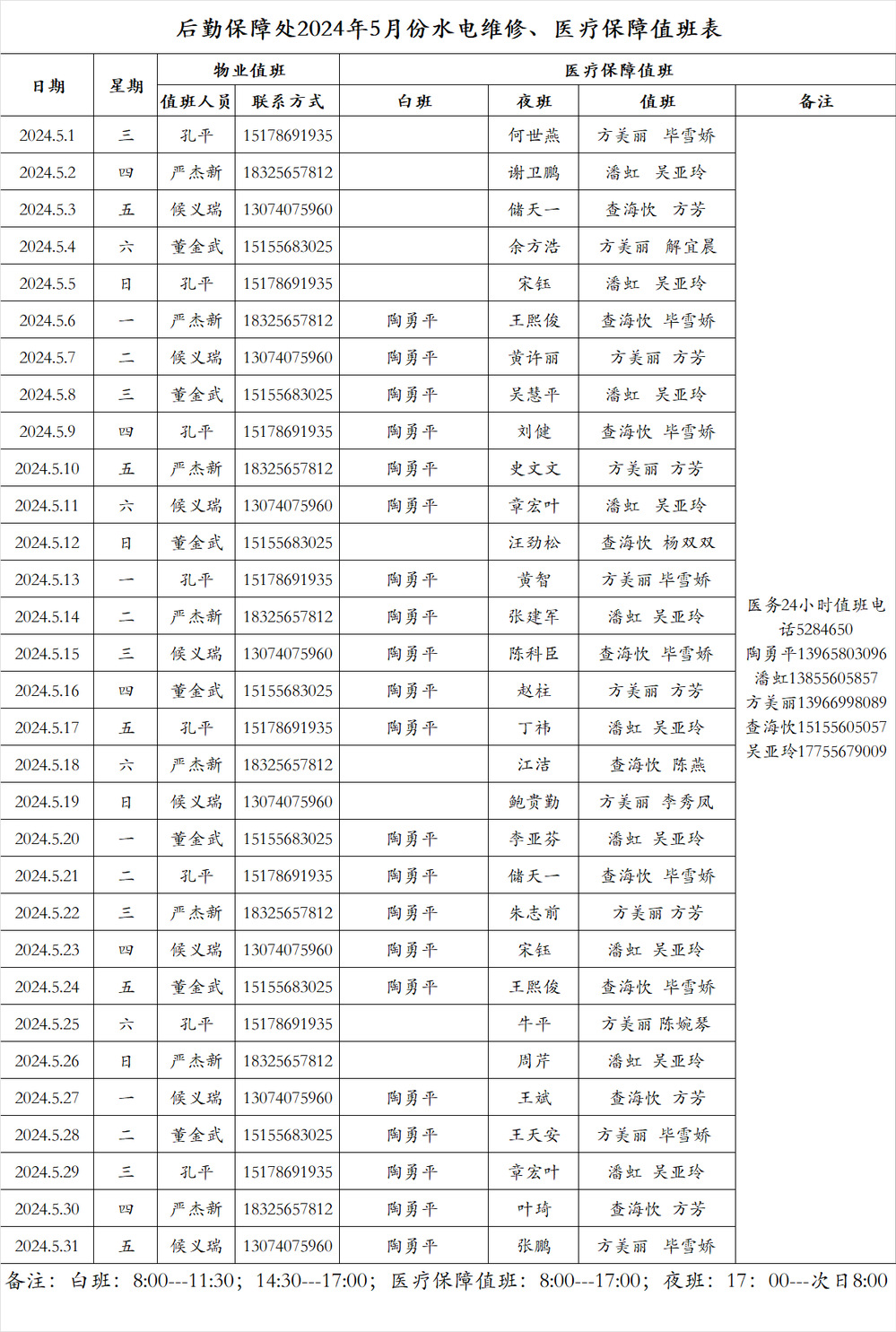 后勤保障处2024年5月份水电维修、医疗保障值班表