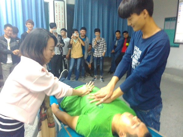 培训现场杨护士首先介绍了心肺复苏的概念、意义,其次杨护士介绍了心肺复苏的三部曲:(1)、手指按压;(2)、开放气道;(3)、人工呼吸杨护士反复提出对当事人采取心肺复苏时,必须动作到位,方法正确,否则无法达到预期效果最后,杨护士以真人为例,现场演示心肺复苏方法、要领、步骤,然后同学轮流操作。通过杨护士的指点,同学反复操作,大多数同学初步掌握了心肺复苏的要领。