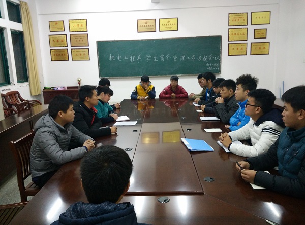 12月22日下午,机电工程系在一栋教学楼208会议室举行宿舍管理工作专题会议。系分管学生工作负责同志主持会议并讲话,专职辅导员及系学生会宿管部同学参加会议。