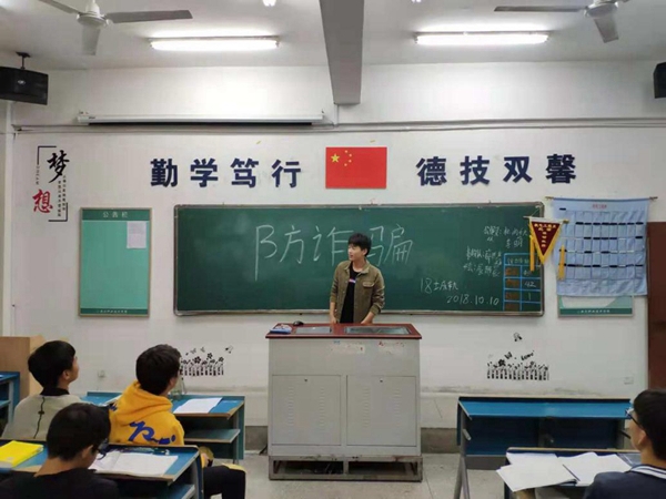 会上,班级同学首先介绍了一些常见的诈骗手段,如电话诈骗、校园贷款、网络诈骗等,部分同学阐述了关于自身被诈骗的过程,重现了当时的情景,加深了同学们对于诈骗手段的认识,提高了同学们对诈骗的警惕心。