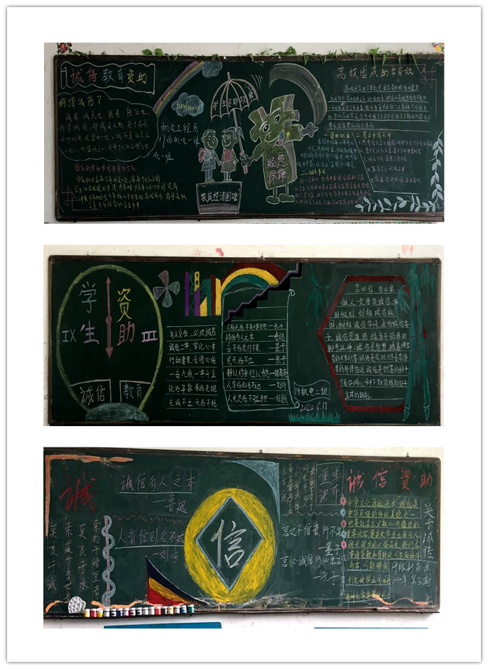 诚信板报,以绘宣扬。系团总支通过黑板报的形式让同学们进一步了解国家助学金贷款政策,普及贫困生资助等相关知识,宣传诚实守信事件,增强法律意识,有效地促使同学们将诚实守信内化为自身素养及行为中。