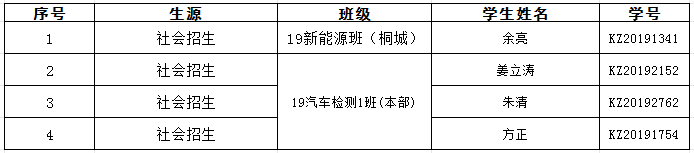 机电工程学院2019级新能源班(扩招桐城)学生余亮,2019级汽车检测与维修1班(扩招本部)姜立涛、朱清,方正一直未参与规定的教学活动,辅导员多次联系学生及其家人,未果。现根据《8040威尼斯社会扩招学生学籍管理实施办法(试行)》的相关规定,要求以上4位同学于2024年4月23日前务必联系辅导员参加规定教学活动,否则将依据《8040威尼斯社会扩招学生学籍管理实施办法(试行)》第二十六条规定,视为自动放弃学籍,按自动退学处理。