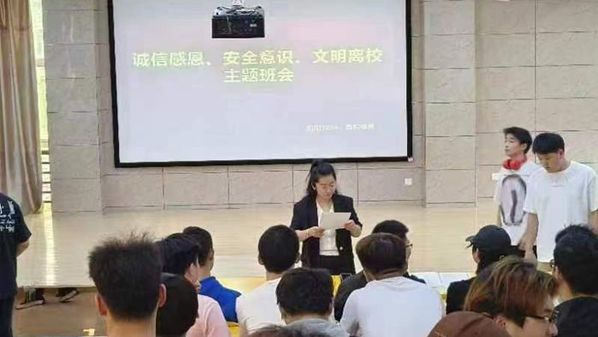 一人一物皆难忘,一草一木亦有情。各班通过播放精心准备的PPT和视频,即将毕业的学生回顾在校期间的学习和生活点点滴滴。辅导员班主任温馨提示返校学生: 一是以身示范,文明离校。坚守高尚的品行和素养,爱护学校的一草一木、一砖一瓦;二是提高安全防范意识,注重交通安全、就业安全、人身安全、财产安全,防溺水、防诈骗、防网恋等安全警示教育;三是铭记校训,秉承“勤学笃行,德技双馨”,在今后的工作中锤炼自身,提高技术,在生活中学会感恩,提高自己的综合素质。