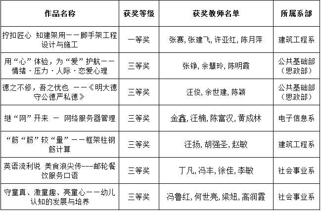 近日,安徽省教育厅发布了《关于公布2020年安徽省高等职业院校教学能力大赛获奖名单的通知》,对比赛获奖名单进行公布。威尼斯官网推荐的参赛作品荣获一等奖1项,三等奖6项。