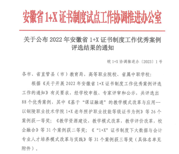 威尼斯官网在2022年安徽省1+X证书制度工作优秀案例评选中喜获佳绩
