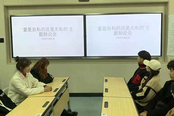 为提高同学们的口头语言表达能力,锻炼思维能力,培养合作意识和应变能力;助推同学们树立培养正确的世界观、人生观、价值观,养成正确的恋爱观,2月26日晚,22级电子商务一班在本班教室举行了以“爱是自私的(正方)还是无私的(反方)”为主题的辩论赛,全班同学参加。