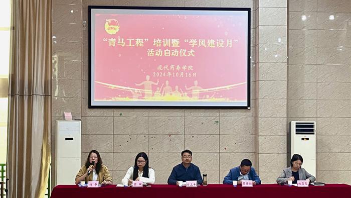 10月16日,现代商务学院于316教室召开“青马工程”培训班暨“学风建设月”活动启动仪式。出席本次仪式的有现代商务学院党总支副书记李三平、学生管理科科长施昌霞、教学管理科科长苏传胜及专兼职辅导员。团总支书记杨筝主持会议。参会的有学院主要团学干部以及2024级各班主要班委成员。
