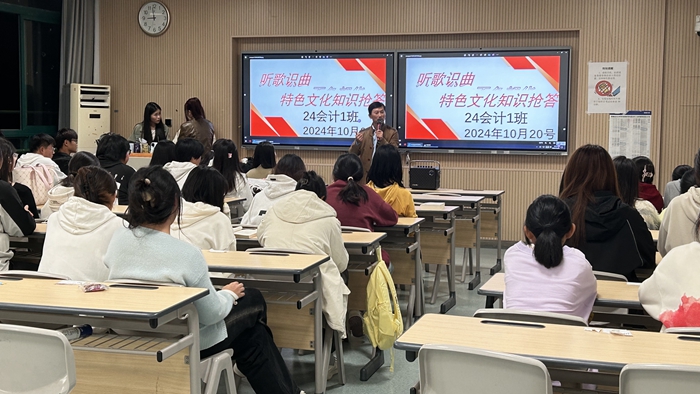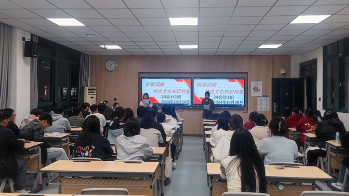 为了让同学们加深对中国特色文化的理解,提升个人的文化素养,推动班级内部的团结与合作,10月20日晚,24级大数据与会计1班于3号教学楼502教室开展了一场别开生面的听歌识曲暨特色文化知识抢答活动。