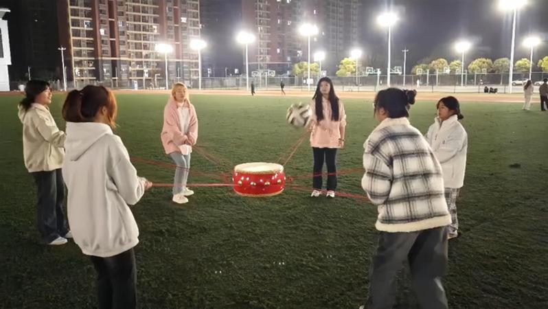 同学们热情高涨的开始了第三项活动——同心击鼓:顾名思义这场游戏团队成员需要共同牵拉鼓面的绳子,使鼓面保持平衡,同时用鼓面接住并弹起球,因此越想弹起球次数多就越考验同学们之间的协调与合作能力,在游戏过程中,大家需齐心协力,统一步调,大家都善于倾听他人意见,相互鼓励,共同进步。此刻同心击鼓不仅是一种团建游戏,更是一种团队精神的体现。在欢声笑语中,团队成员间的距离被拉近,心更紧密地连在一起。