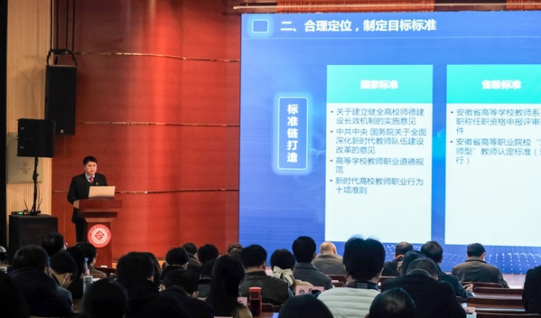 毕明生作题为《深耕内涵建设,打造办学特色,以教学诊改全面推进学校高质量发展》的工作汇报,从诊改思路、两链打造、螺旋运行、引擎驱动、信息化平台、高职扩招、成效与反思等七个方面汇报了学校教学诊断与改进工作开展情况。