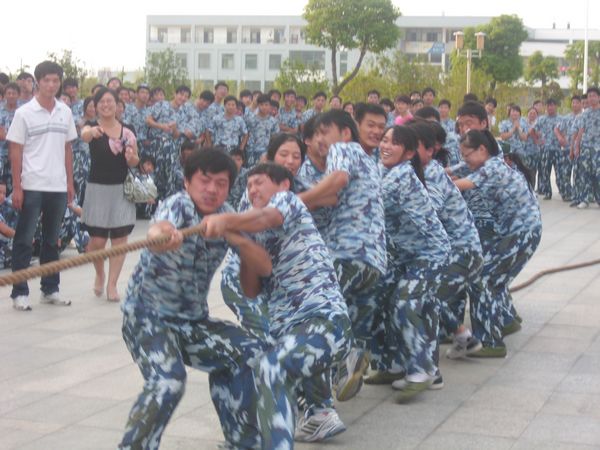 下午16:30,在军训场地,大一新生连与大二各班代表又展开了另一轮“较量”――拔河。所谓“长江后浪推前浪”,大一同学们借着军训士气一举击败了大二9个班!势不可阻。决赛时分,新生(3)连VS 10造价(4)班,古人云“人心齐,泰山移”,历时近两分钟的较量,10造(4)荣获第一。