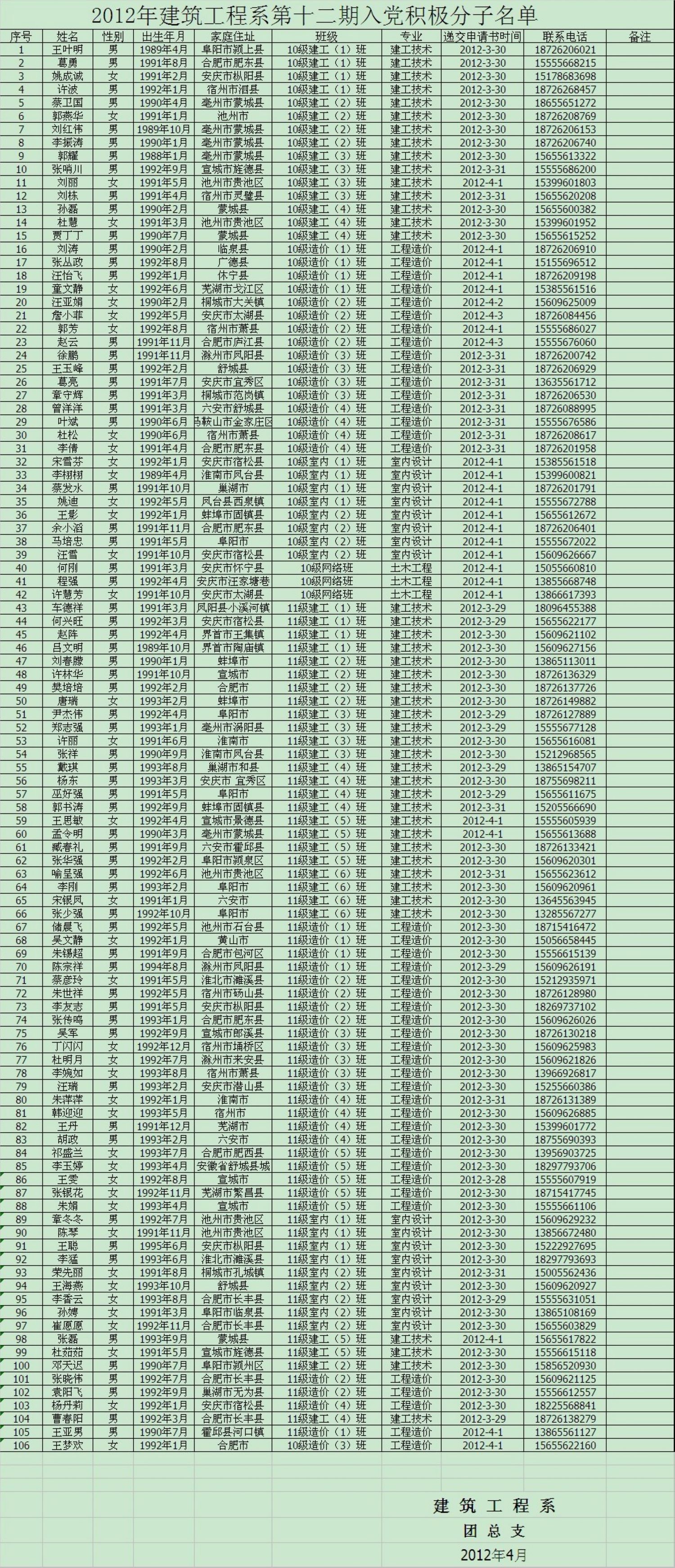 2012年建筑工程系第十二期入党积极分子名单 .xls