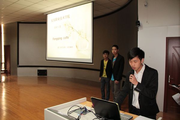 我系“风情咖啡”代表队进行了第一组的团队展示。他们在几分钟的时间里,用ppt以及现场阐述等方式展示了团队的特色,体现了团队的凝聚力和协作能力,给大家留下了深刻印象,为比赛进行了很好的预热。