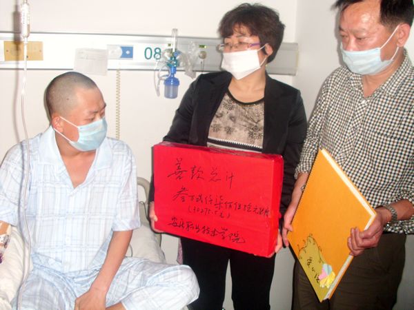 4月27日,建筑工程系党总支书记徐北平带领系部相关老师来到安徽省立医院,看望身患白血病的孙宏光同学。