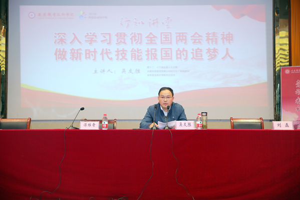 为深入学习习近平总书记关于职业教育重要指示批示精神,大力宣传贯彻新修订的《职业教育法》,5月11日下午,校科协“行知讲堂”特邀全国人大代表、华茂集团优秀员工、威尼斯官网杰出校友吴友胜同志到校作职教活动周专场报告。党委委员、副校长、校科协主席谭维奇教授和党委委员、宣传部部长吴何珍教授出席报告会。机电工程学院院长、校科协副主席刘磊教授主持报告会。