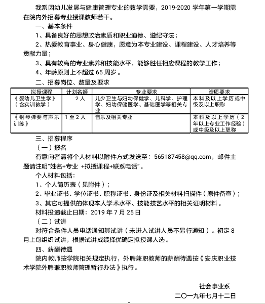 关于招募幼儿发展与健康管理专业教师的公告