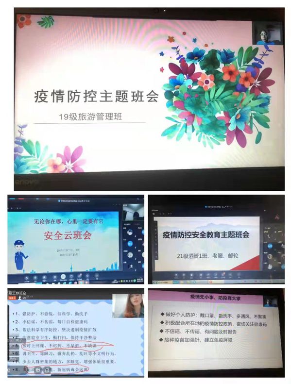 同时,为加强疫情期间的学生教育管理,各班级通过钉钉直播、视频会议等形式举行了线上“疫情防控安全教育”主题班会,让学生了解当前的疫情态势,宣传疫情防控健康知识,并就线上教学安排等向同学们进行说明,要求同学们遵守考勤纪律、积极自觉上课、保证学习质量。