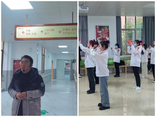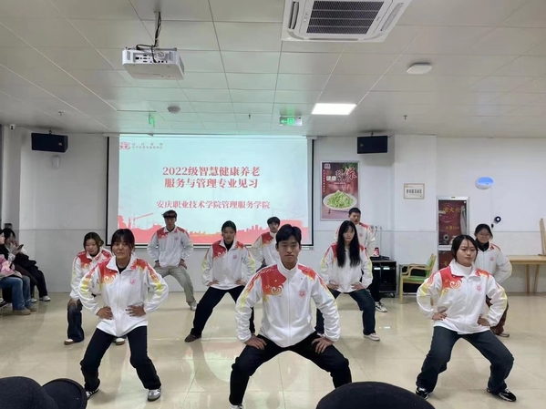 校外导师首先带学生们参观了福见康养养老院,了解了养老院的整体构造与组织运营,帮助同学们深入了解智慧养老院的服务与运营模式、岗位工作职责及所需专业技能,加深同学们对养老行业和职业的认识。在校外社工导师的指导下,同学们以员工的角色体验养老工作的相关岗位,协助老人参与各类活动。同时还组织了一场“养生快乐”趣味活动。同学们为老人们带来了精彩的文艺表演,有八段锦、手势舞、歌曲演唱、舞蹈等,多彩的节目不仅丰富了老人们的精神生活,也让学生们展示了才艺,传递了爱心。